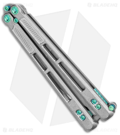 - Stonewashed titanium handles with green hardware.