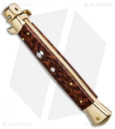 This 11″ Italian Stiletto from Frank B. features classic stiletto style with a snakewood handle and a gold finished dagger blade. Frank B creates some of the finest authentic Italian stilettos available on the market today. This 11″ model has a snakewood handle with gold plated bolsters. Brass pins and liners add a classic touch to the design. Add the premier Italian knife-maker to your collection today with an authentic Italian stiletto from Frank B.