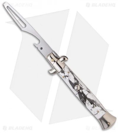 This 8.5″ Italian Stiletto from Frank B. features classic stiletto style with a white marble handle and a cleaver bottle opener blade. Frank B creates some of the finest authentic Italian stilettos available on the market today. Brass pins add a classic touch to the design. The bottle opener is made from stainless steel with a satin finish. Add the premier Italian knife-maker to your collection today with an authentic Italian stiletto from Frank B.