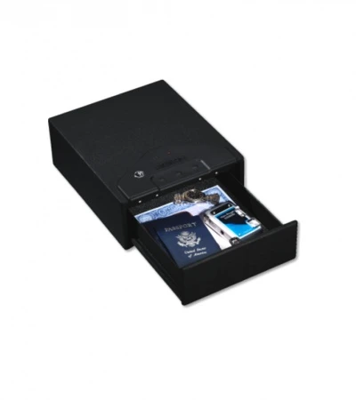 This Stack-On Quick Access Drawer Safe features an electronic lock that is easy to program and allows for a 3 to 8 digit combination code. IT features a ball-bearing drawer that pops out when locking mechanism is released and a foam padded bottom. Holds standard size pistols, important documents and/or other valuables. This safe is designed to be secured with a cable (1550 lb. test) or can be mounted to a shelf or floor. Cable included. QAS-1000